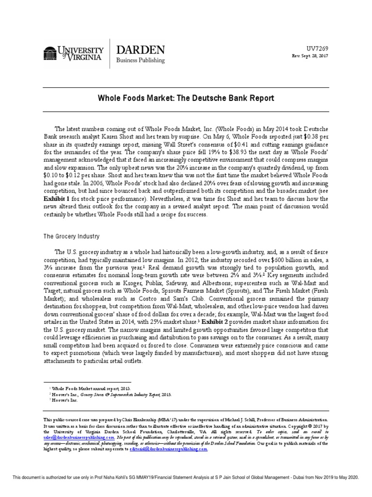Darden School of Business. 8 am 9 pm. Whole Foods in May 2014 took Deutsche Bank research analyst Karen Short and her team by surprise.